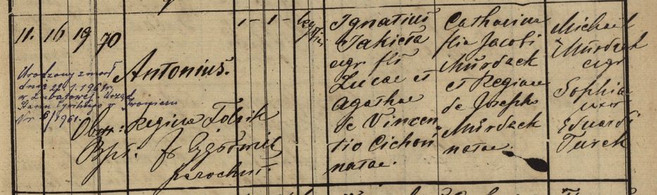 This marriage record gives me both of their birth dates, and the #70 house number tells me Antoni is still living in the house his family lived in when he was born in 1893. The bottom of the form, in blue writing, says “husband died 23 January 1961, Lubatowa”. I don’t have any information on Lucia’s death.