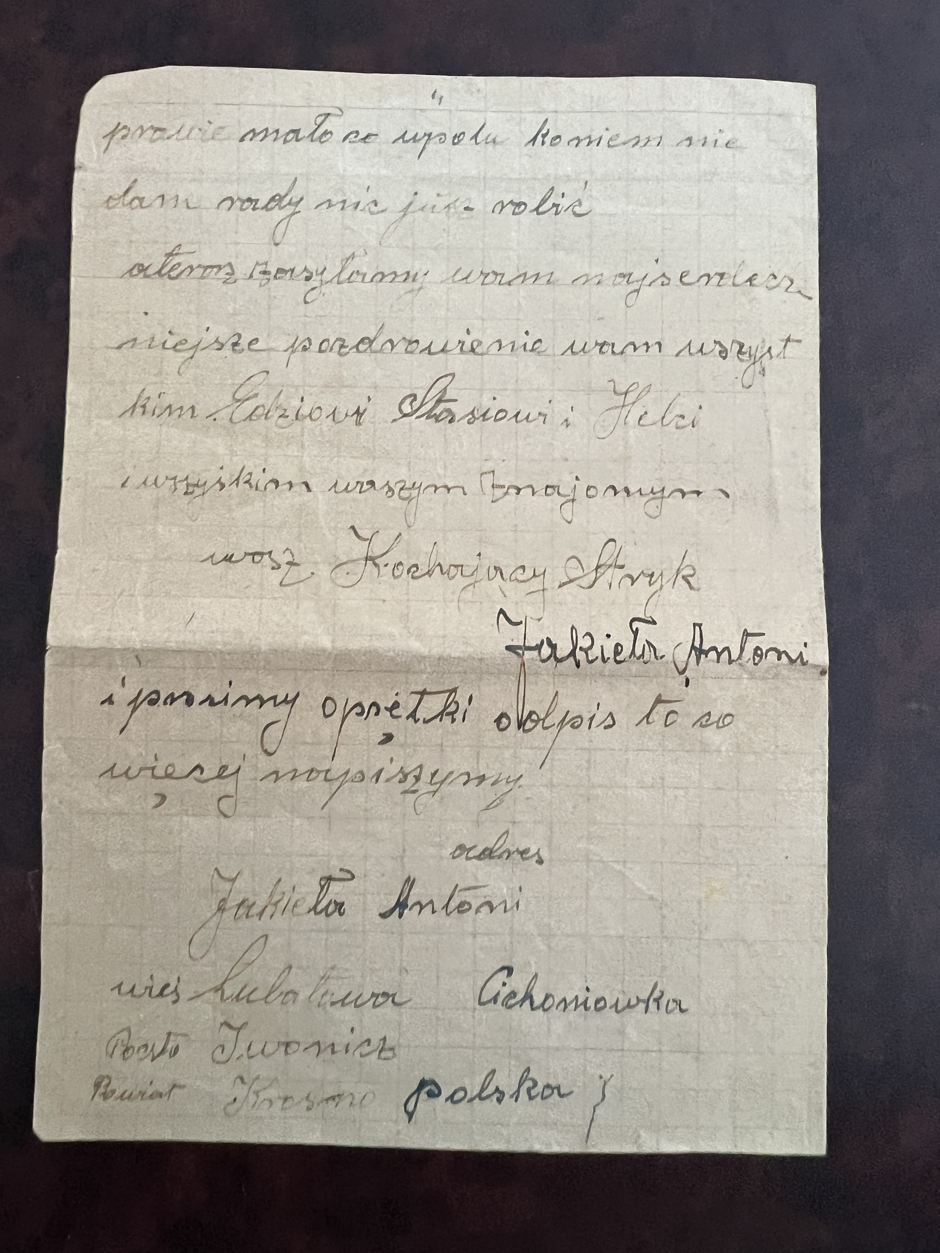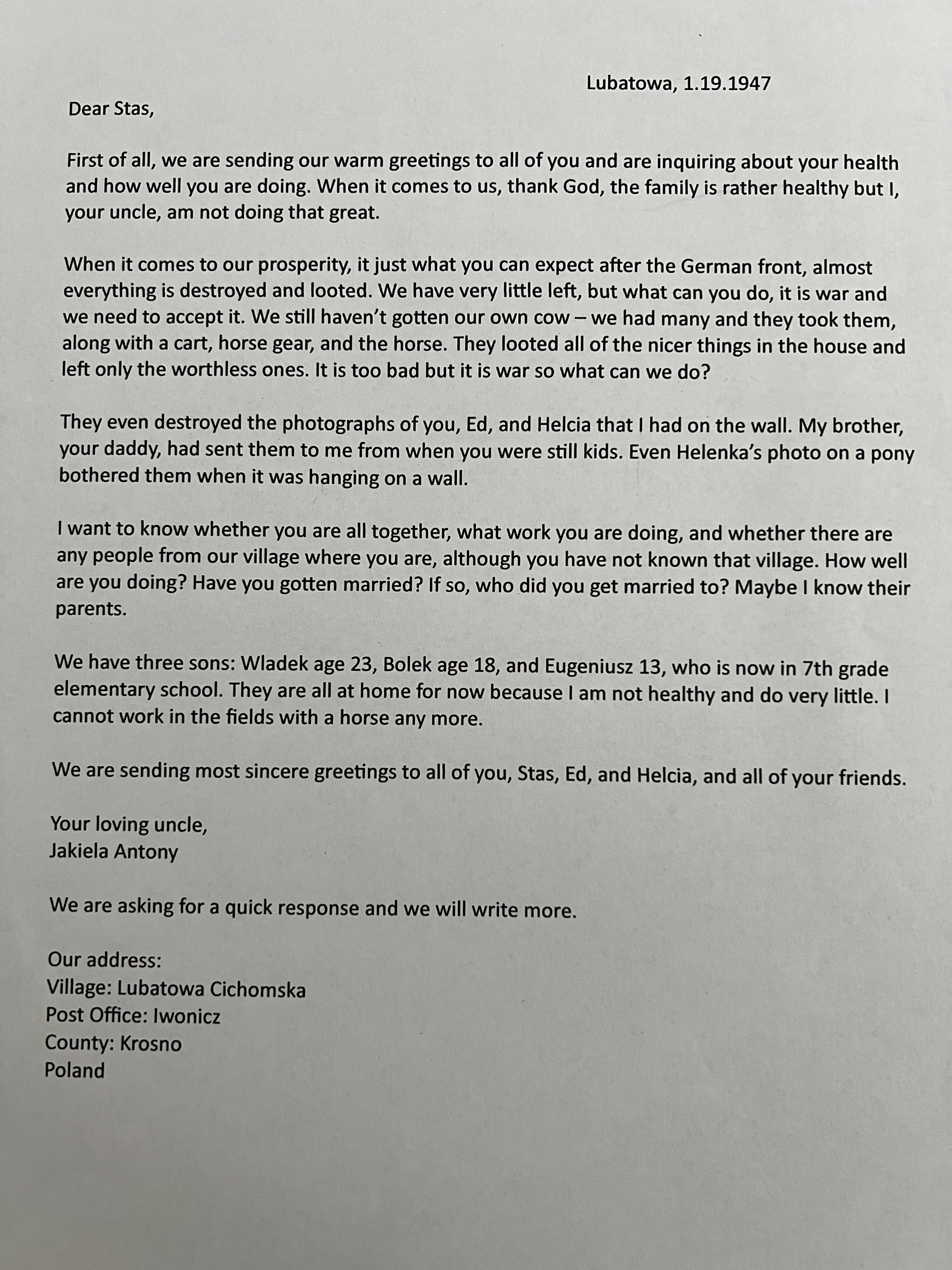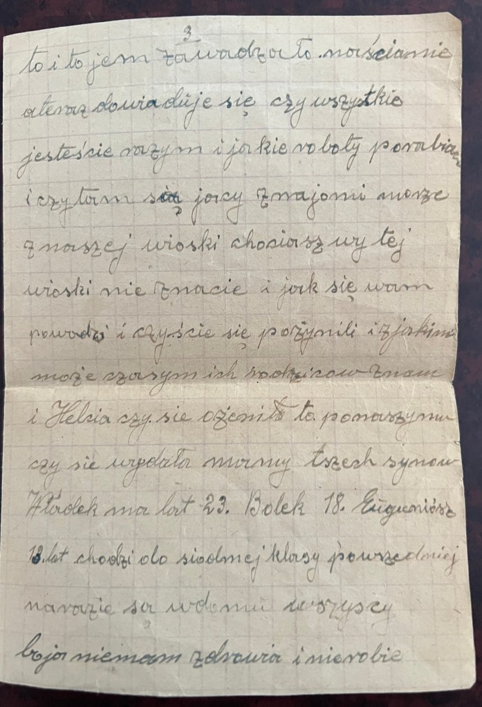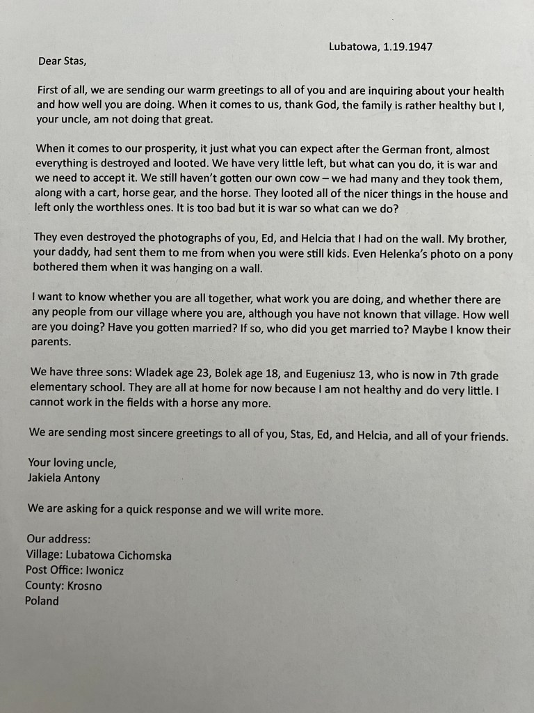 An amazing treasure that provided information on Antoni and his family was found while cleaning out my Auntie Helen’s apartment after she passed away in February of 2015. It was a letter from Antoni to Steve, Helen’s oldest brother. The information and questions in the letter indicate that there had been little communication between them. The letter was dated January 19, 1947, almost 12 years after their father and Antoni’s brother Charles had passed away. Of course, the letter was in Polish, and evidently, “old style” Polish, which was difficult for a fluent speaker to translate!