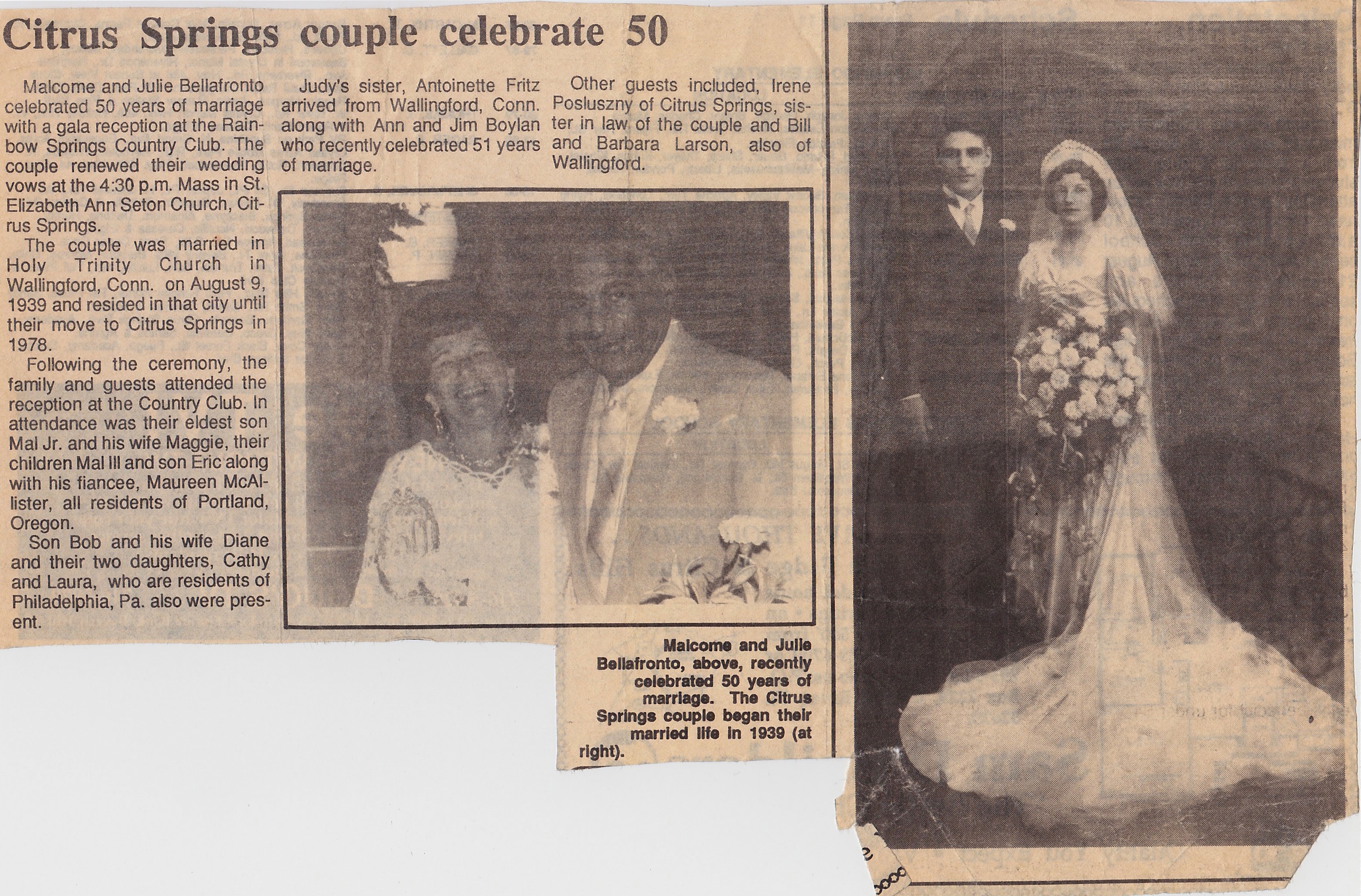 What did the Bellafronto family think of you? They tolerated me and they had to because…No, I think my mother in law liked me but she was very domineering. She was born in the United States and went to Italy on a visit and met Mal’s dad, and they got married. Mal loved his dad dearly and was the only one in the family who did. For years and years we would go to their house for a meal and he’d come downstairs, eat and go back up! We were shocked that he came to our wedding. When his mother was dying, she took my hand and said you’re the best thing that every happened to my son. The family was different. You had to know them. They didn’t know how to mix. They were good to me though.