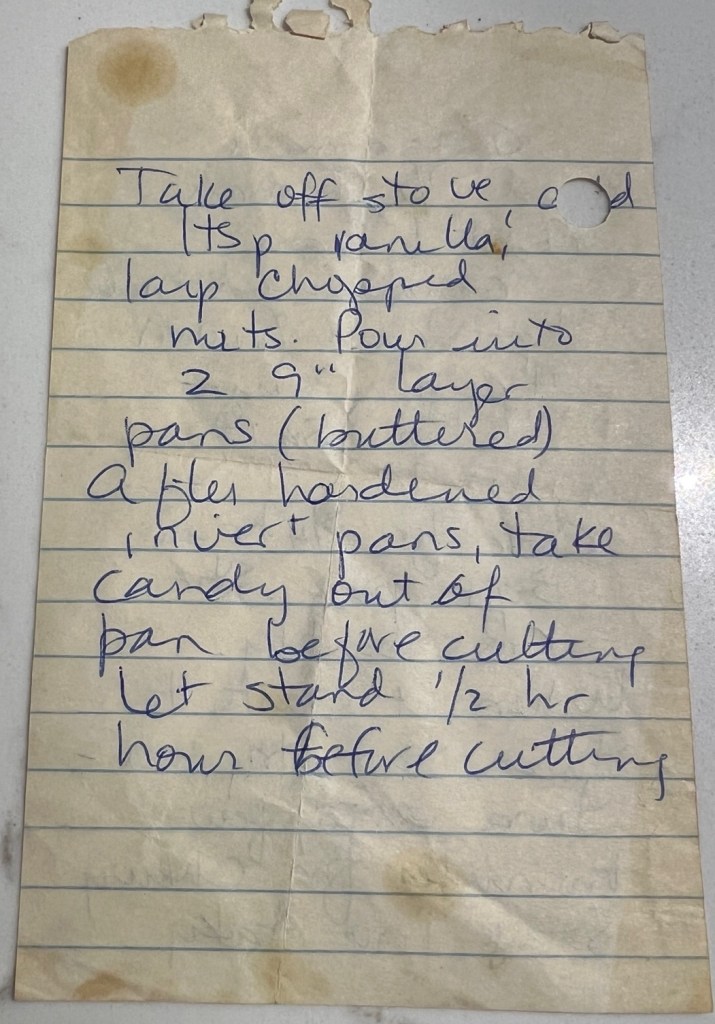 The pans were 9” square metal pans and after they were filled she would put them out in the back hall to freeze because she only made them in the winter. They would stay there for a day or so until they were very hard and then she would cut them into squares or rectangles, or however they broke up. One time by mistake she put in root beer extract instead of vanilla and we liked those just as much as the regular ones! They got wrapped in wax paper and tossed into a paper grocery bag.