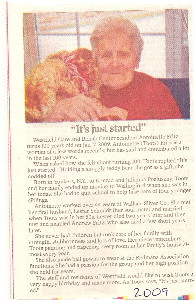 Aunt Tootsie continued to live in the house on Clifton Street until she moved to an apartment in the Judd Square apartments and then to Westfield Nursing home. She died in September 2010 at the age of 101.