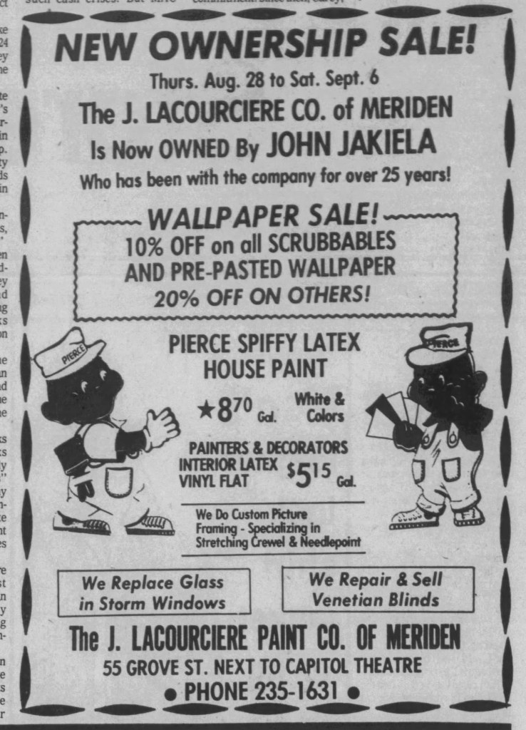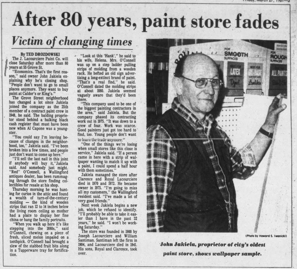 As I mentioned, there was a Wallingford Lacourciere store and that was run by Oryle, a younger brother, born in 1911. Judging by the advertisement that Oryle and his wife printed in the newspaper, it looks like, to me, that they wanted to take advantage of the fact that the Meriden store was no longer owned by the Lacourciere family! Oryle closed his Wallingford store in 1980.