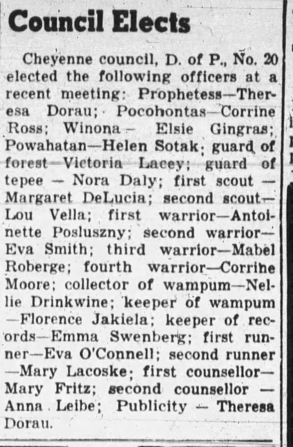 The first “tribe” in Connecticut was the Hammanssett No. 1 tribe in New Haven established in 1880. Within 50 years, there were 38 additional tribes of seven thousand members along with the Degree of Pocahontas with several thousand members of its own. The Wallingford men’s tribe was Owenoco and the local women’s tribe Cheyenne Council No. 20.