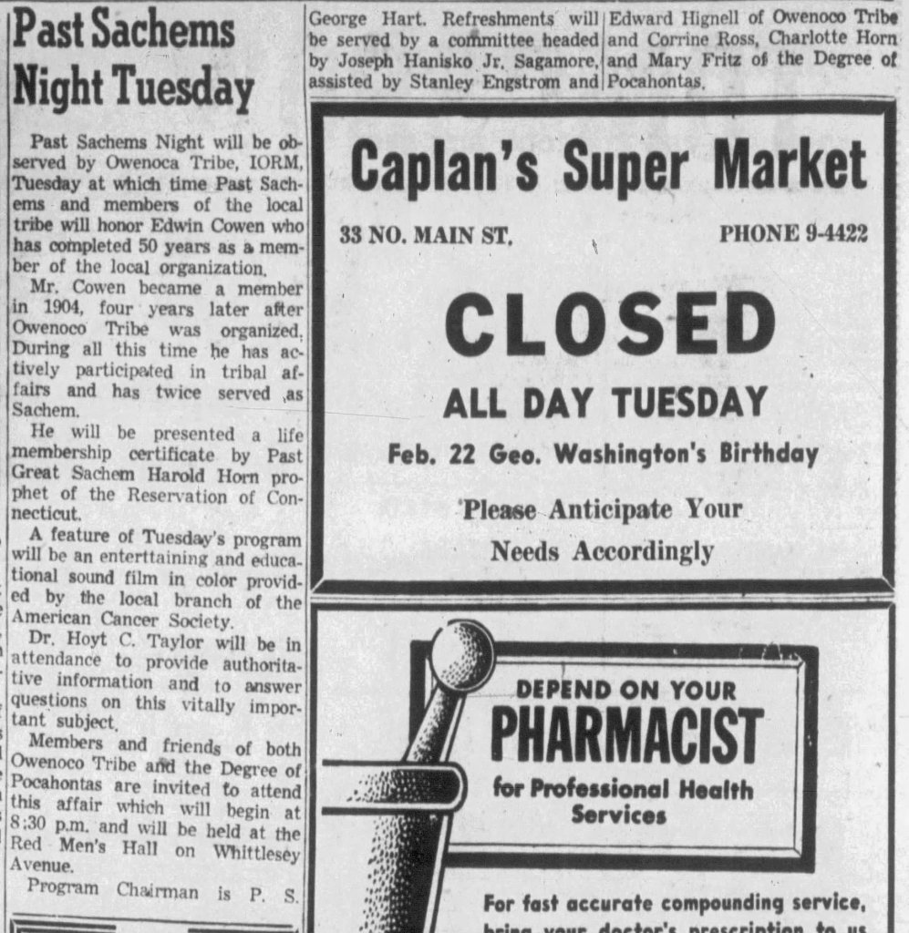 In addition to meetings, the Red Men and Pocahontas groups held fundraisers and presentations such as this one from 1955. (Notice the ad about Caplan’s being closed for George Washington’s birthday!)