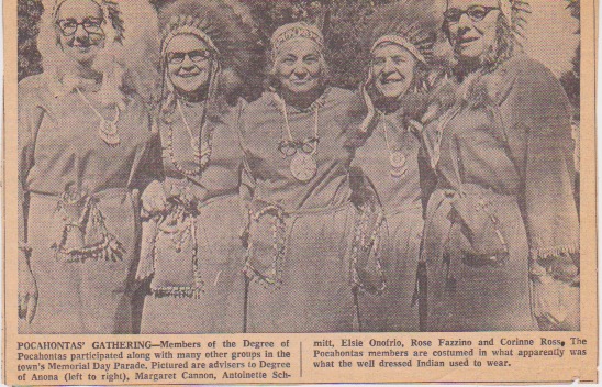 The Women’s Auxiliary of the Improved Order of Red Men was The Degree of Pocahontas. It was believed that Pocahontas’ brief life presented a touching and beautiful picture of grace, beauty, and virtue, as well as “constant friendship to the palefaces.” The group patterned itself after the virtues of the original Pocahontas, those virtues of teaching kindness, love, charity, and loyalty to one’s nation. (information from the official website http://www.redmen.org)