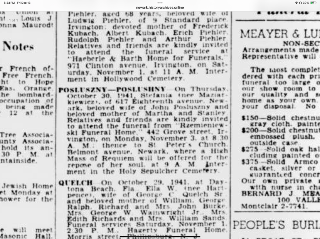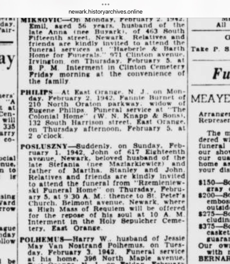 This search for information on John Posluszny’s death may have started 20 years ago, but with these people, I just can’t quit. Saturday, I started looking for obituaries for John and Stefania. I am still surprised that Ancestry hasn’t revealed them to me. I checked Newspapers(dot)com, nothing, nothing, nothing. I checked Google newspaper archives, but there were no New Jersey papers for Newark.