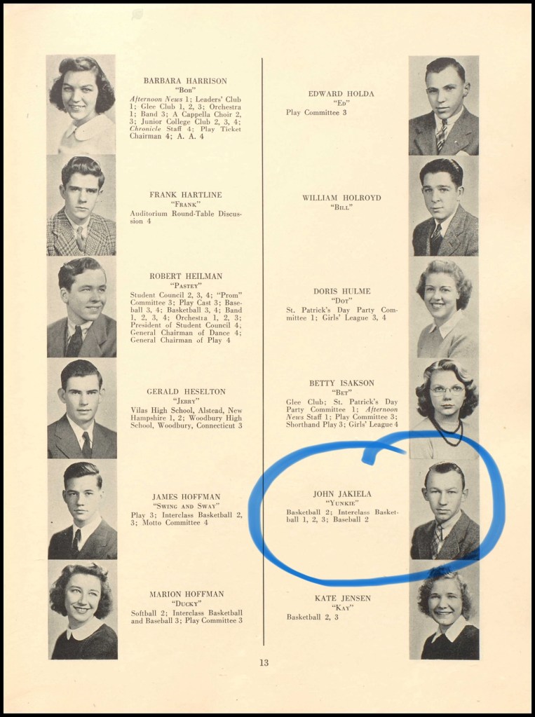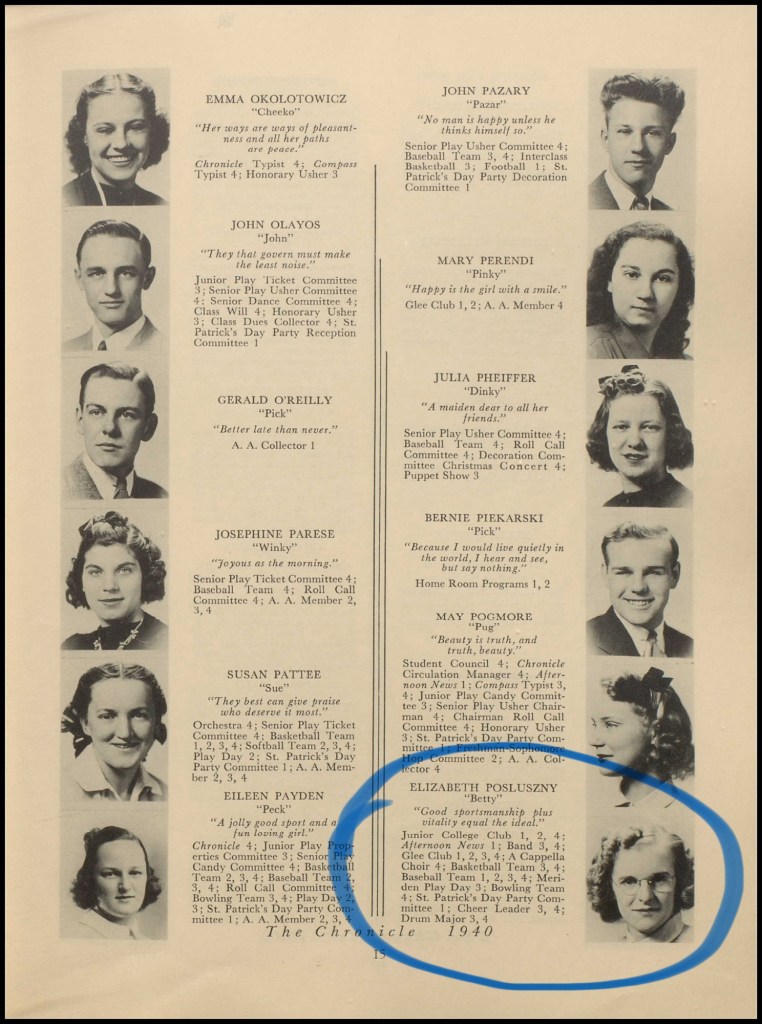 My mother, Elizabeth Ann Posluszny was born in 1922, and my father, John Steven Jakiela in 1924. They attended Lyman Hall High School together and my dad’s brother Walter was in my mother’s graduating class. I don’t know if they knew each other through their school years.