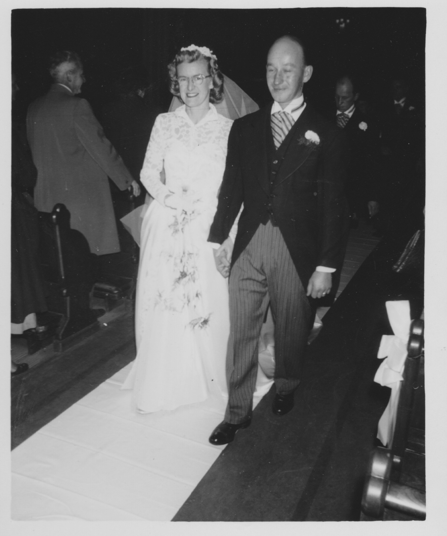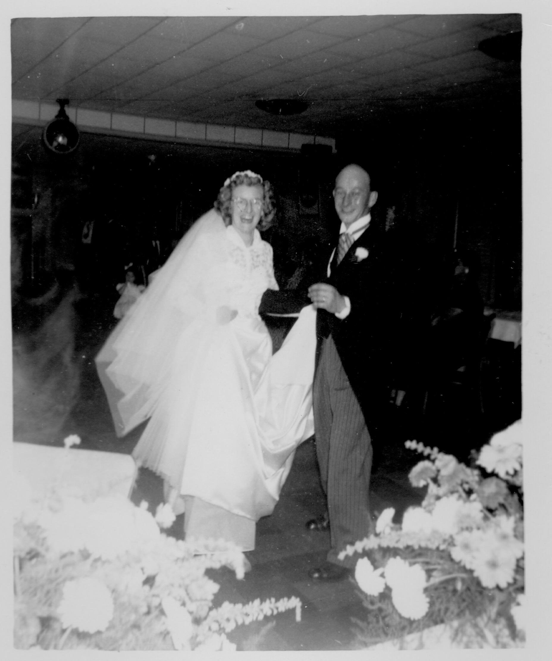 Betty was 30 on her wedding day and John was 28. Her mother was a widow and John lived with his oldest brother and his family so there was not likely a lot of money for a wedding but it was still beautiful. She had a timeless dress that was later worn by my sisters for their weddings. John and his groomsmen were in handsome morning suits.
