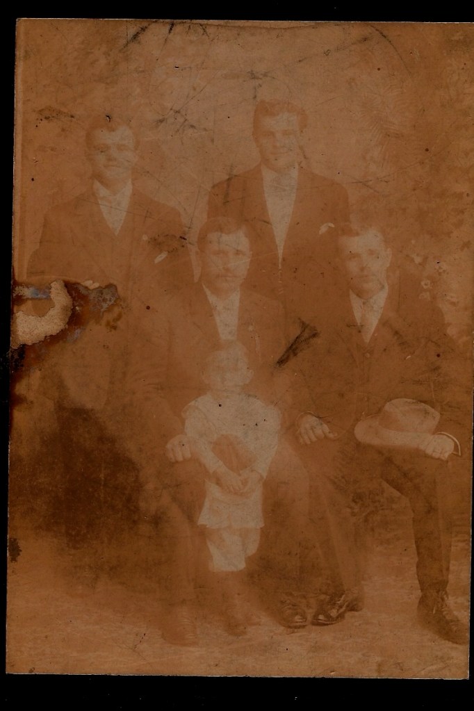 Something puzzles me though. Jumping ahead a few years, the 1910 Federal Census lists a son John, 7 years old, which means he was born about 1903 and in the United States. The 1905 census doesn’t include a child or a wife but you’ll see further down this post, a marriage license says his first wife died. The Posluszny Family portrait was taken about 1907 based on the appearance of young John (front row left) and young Walter (front row right). I think the picture of John and his son and the picture of the four brothers was taken at about the same time.