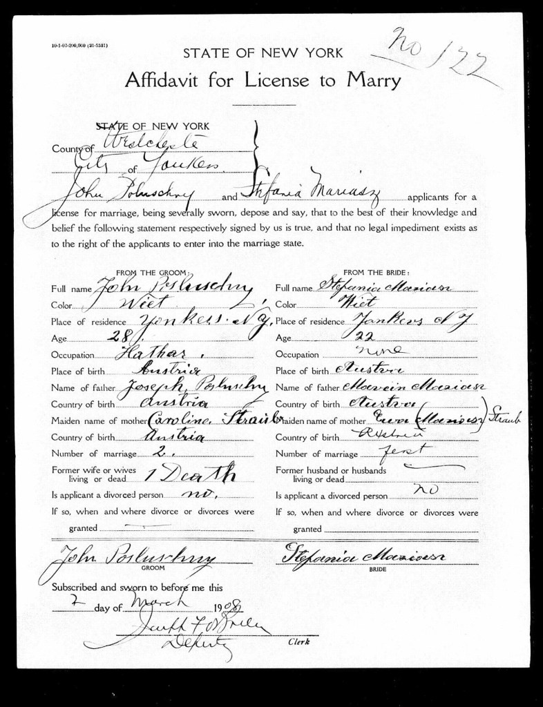 He married Stefania Mariasz in March in 1908. She immigrated in December of 1907 with her sister Karolina and they were heading to their cousin, Johann Straub on Jefferson Street in Yonkers. Johann Straub and Jefferson Street are names that have popped up regularly for Posluszny family members when they arrived in the United States. The marriage license says John was married before and his wife had died. I have no record for that and no birth record for John Jr.