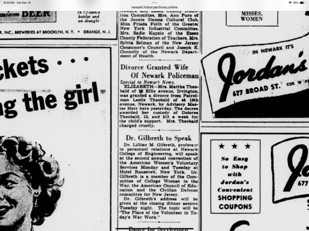 Martha was married at 22 in 1928 to Leslie Theobald, a police officer for Newark. They had a daughter, Dolores and they were divorced in 1941. Their daughter, Dolores married Theodore Kozlowsky in 1951 and they had three children. I’m still researching to add them to the family tree.