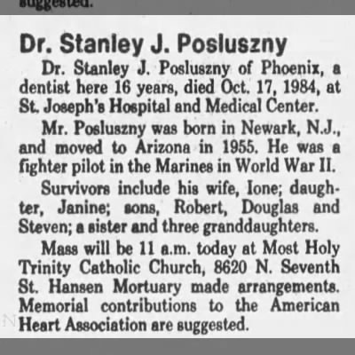 He ended up back in the New Jersey/New York area and I believe he was married, had three sons, and was then divorced. I don’t know when he continued his schooling to become a dentist. Interesting note – his aunt Mary Posluszny Biega also had a son, Stanley G. and he became a dentist here in Connecticut.