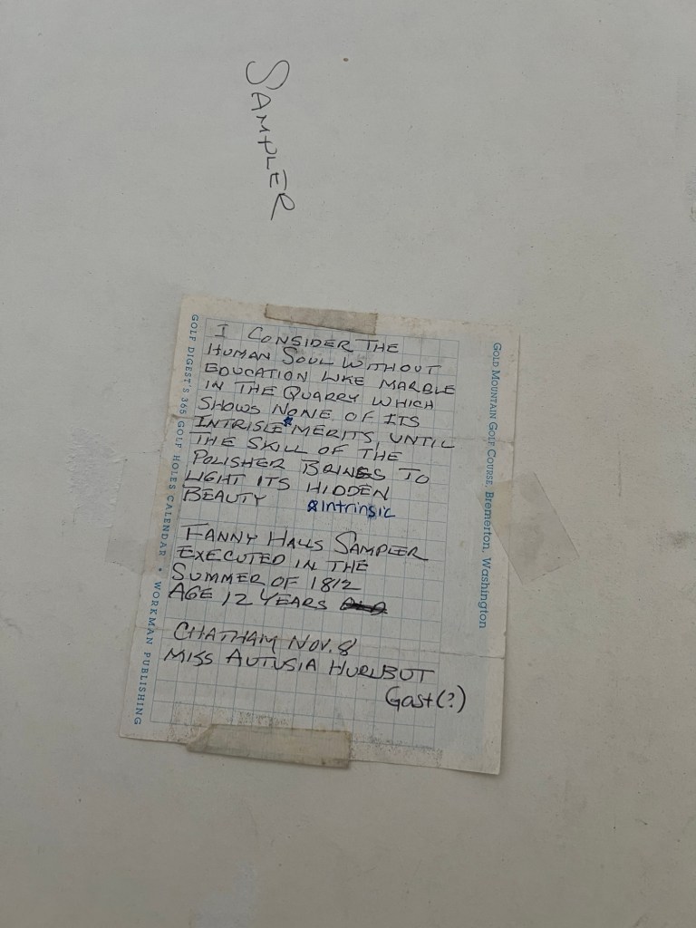 In 2017, I made inquiries to 2 antique stores I found online who worked with samplers. After sending pictures, one wanted me to send it to them to appraise and both were not thrilled with the condition of it and said it would sell better if it was mounted and framed which could cost in the area of $1,500. Since my father was a picture framer, I was not shocked by that cost. So, I dropped the idea and continued to hang on to it.