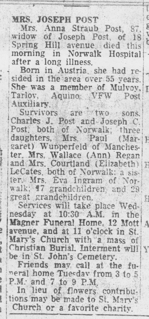 The next generation, Joe and Anna’s grandchildren, were people I have met in the past. Ann married Walter (Wally) Regan and they had eight children. Margaret married Paul Wupperfeld and they had four children. Charles and his wife Mayre, were childless, Joseph Jr, and his wife, Dorothy had 2 children, and Elizabeth and her husband, Courtland (Court), had four children. The Regans and the Wupperfelds attended the Fourth of July picnics at Pickerel Lake, hosted by two aunts and uncles. Joseph and Anna possibly were there as well. In my head, I hear Aunt Judy calling them “the Fairfield Posts”, and “Uncle Joe”. We also attended a party at Crystal Lake in Ellington hosted by one of the Wupperfeld children when I was about 10 or 11. I have a connection with one of Joe and Anna’s great-grandchildren, Jennie, through Ancestry and her family tree contains at least 25 grandchildren and many great-grandchildren. Like my relative through John Posluszny, I appreciate that connection to the past.