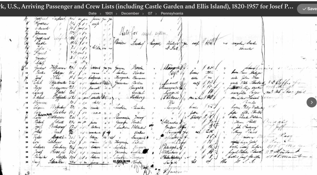 At 17, he departed for the United States on November 24, 1901, and arrived in New York Harbor on December 1st. His ship, Pennsylvania, departed from Hamburg, Germany, with stops at Boulogne-sur-Mer, France, and Plymouth, England, before arriving at its final destination of New York harbor. He was in Zwischendeck, better known as Steerage. Two weeks door to door, I wonder what he was thinking as he traveled. There is no person on his manifest page coming from Wildenthal so it appears he traveled alone.