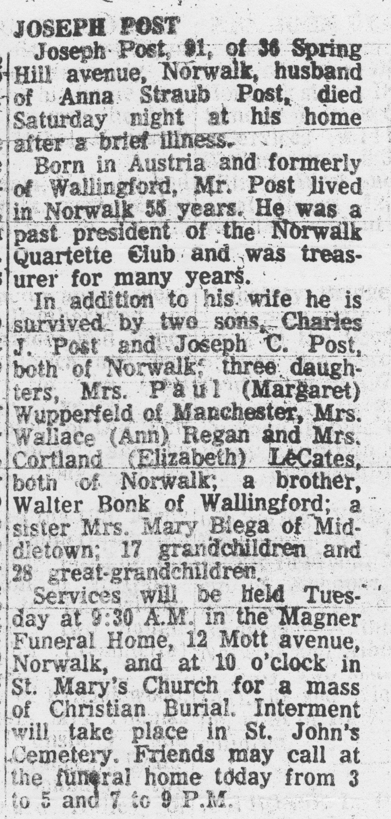 Joseph died at 90 years old on November 9, 1974, in Norwalk. Eleven months later, Anna died on October 20, 1975, at 87 years old.