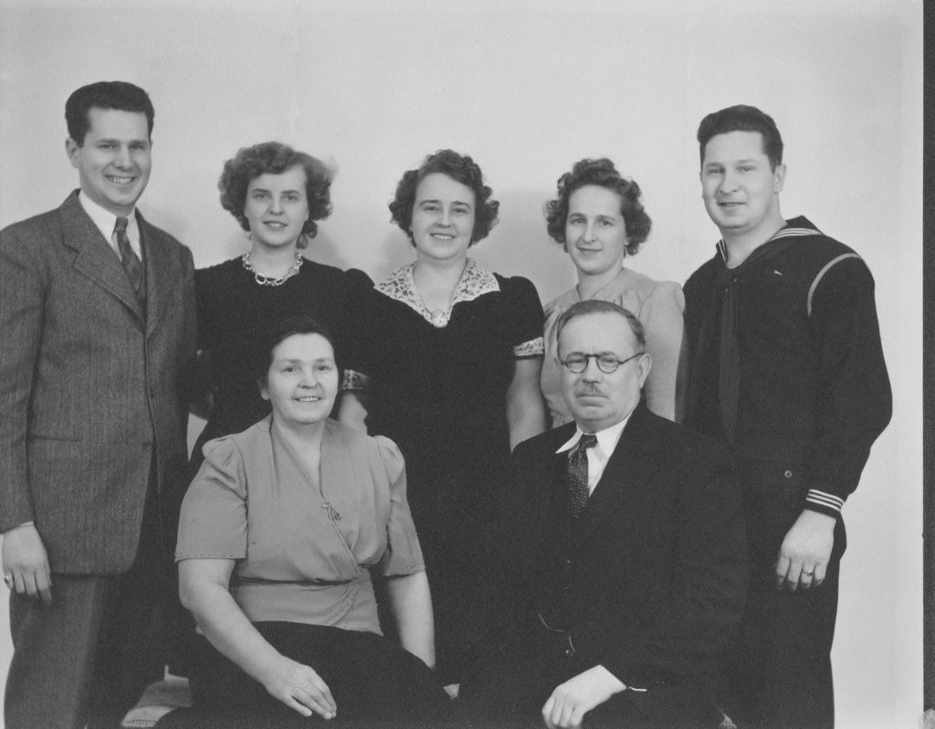 Wedding party – brother, Charles is floor left, and John floor right. Brother, Konrad (other records say brother, Frank) standing second left. Back right, Ann’s brother, Adam Straub and wife, Margaret. Seated right, Anna’s brother, Lawrence Straub, wife Josie, top left. Unsure if Julianna is woman 3rd from left.