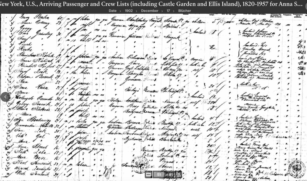 Anna departed Hamburg Germany on the Blücher and arrived in the United States on December 17, 1902. She headed to the home of her sister, Eva Straub, in Brooklyn, NY, with $12 in her pocket.