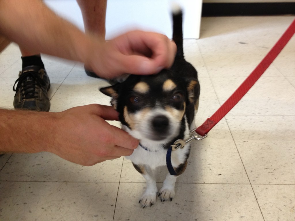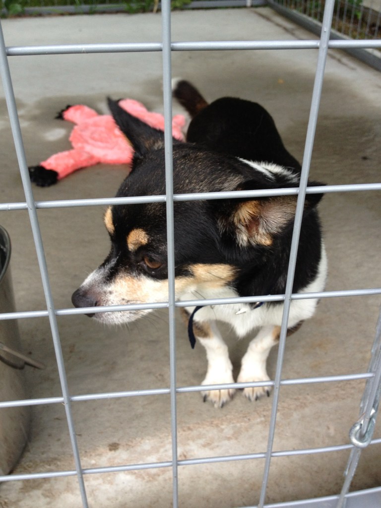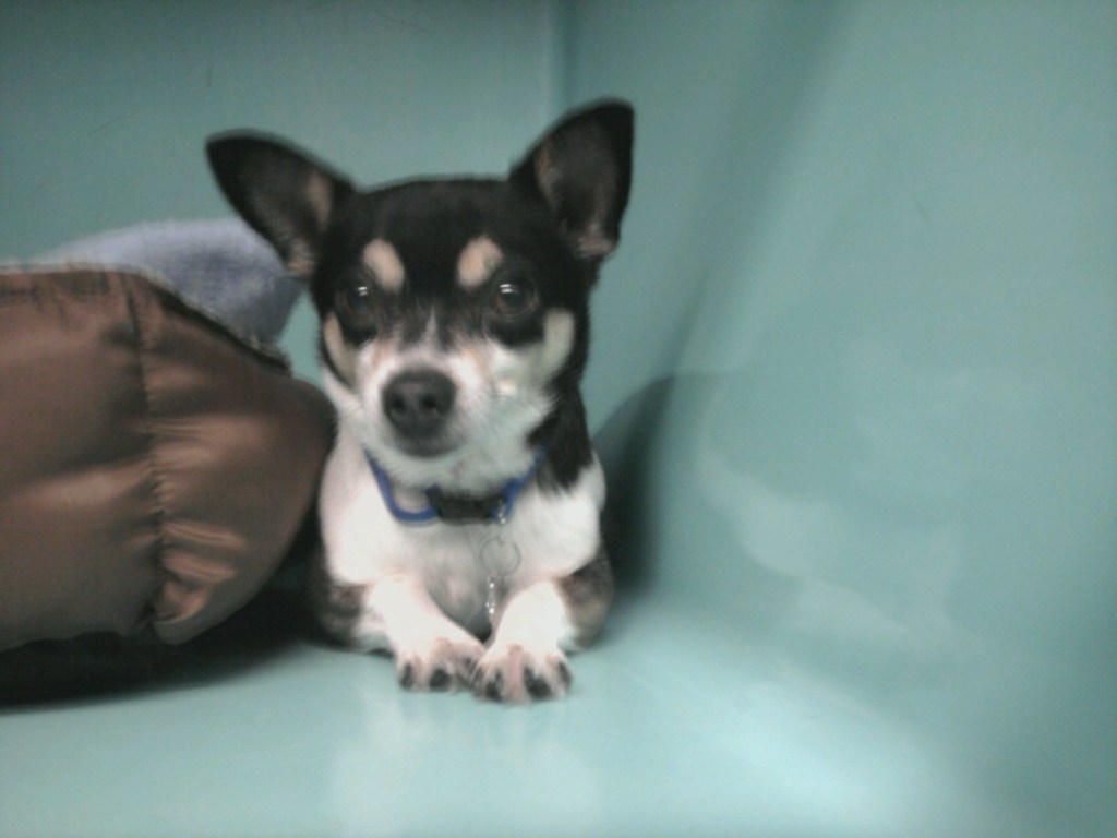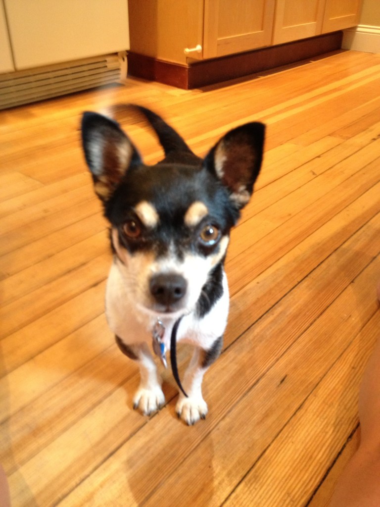 One afternoon, July 27th to be exact, I took a trip to the Meriden Humane Society and said, “I want to look at small dogs”. A worker brought me outside to the dogs in their cages. I took pictures of 5 or 6 dogs all eager and excited to see me and show off how fetching they were. Except for one. A black and brown and white chihuahua / terrier mix. He just would not look me in the eye!