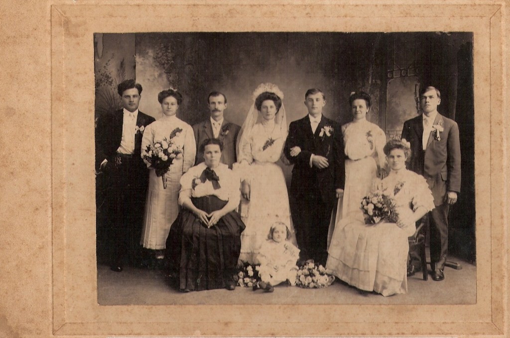 He followed his brother John to New Jersey where he met and married Josephine Huth on August 1, 1909, in Newark, New Jersey. Josephine was born was born on December 24, 1892 according to her citizenship paperwork. He was 20 and she was 17 when they got married. In the photo below, Frank’s brother Charles is standing left, stepdad John Bonk 3rd from left, Caroline, his mother, seated left, and Mary, his sister, seated right.