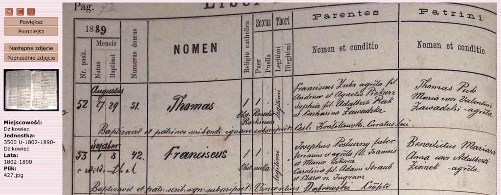 He immigrated to the United States in 1905, according to the 1910 census. There is a Hamburg Passenger list dated 1907 for a Frank Posluszny who matches age and departure village; however, without locating a ship manifest from Ellis Island, I can’t confirm which date is fact.