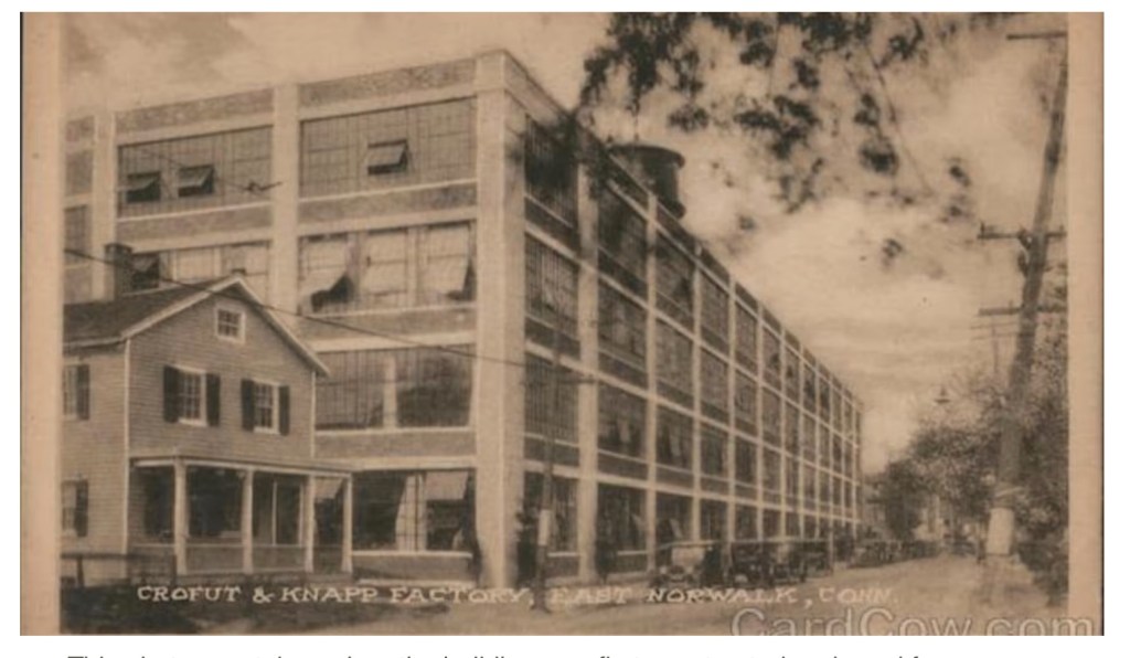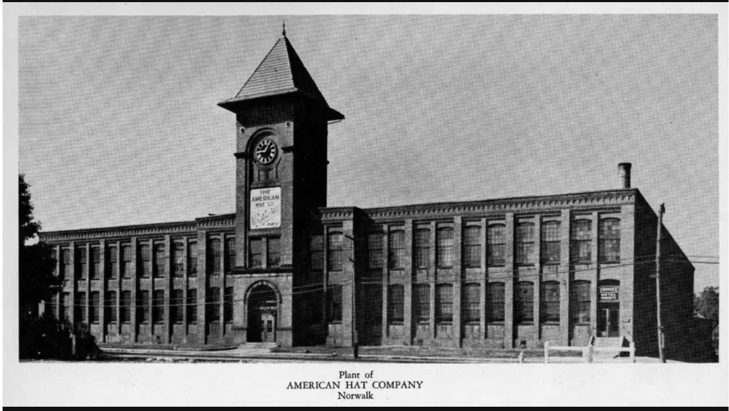 By 1940, still working in the Hatting industry, he has moved on to Hat Corporation of America located at Van Zandt Street in East Norwalk and is working as a finisher. This company was a merger of three hat companies: Crofut and Knapp, Cavanagh Hats, and the Knox Hat Company. This building still stands, although with updates over the years.