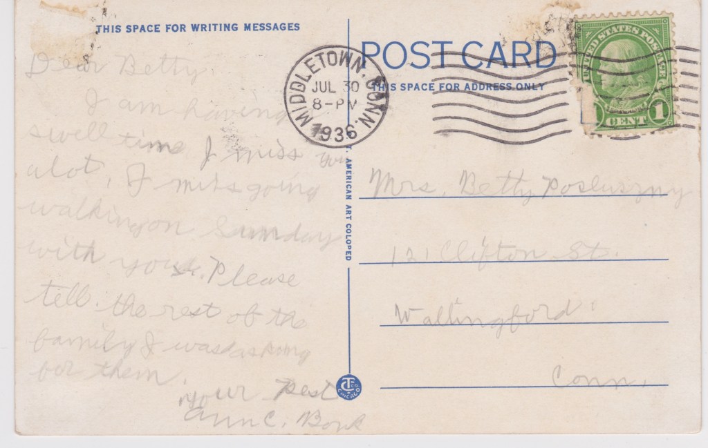 Ann’s postcard sent from Middletown when she was 10 and my mother 14 says: