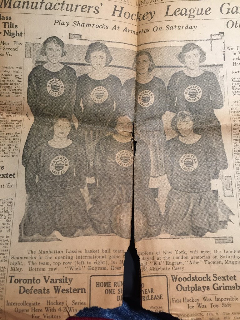I wrote in my previous post about Katherine and Louise playing basketball but not finding much information after January 1923. Cousin Brian sent this wonderful picture via text. It’s from January 1924 and the caption talks about the team being the champions of New York meeting the London Shamrocks in the opening international game. From the surrounding snippets of articles it appears this is taking place in Canada. I searched again for information on the team but came away with nothing.