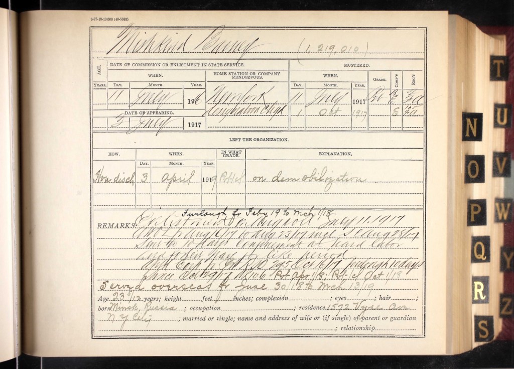 I did a little digging on Barney and found a military record. He enlisted in the military on July 11, 1916 and mustered on July 11, 1917. Remarks on this particular form say: