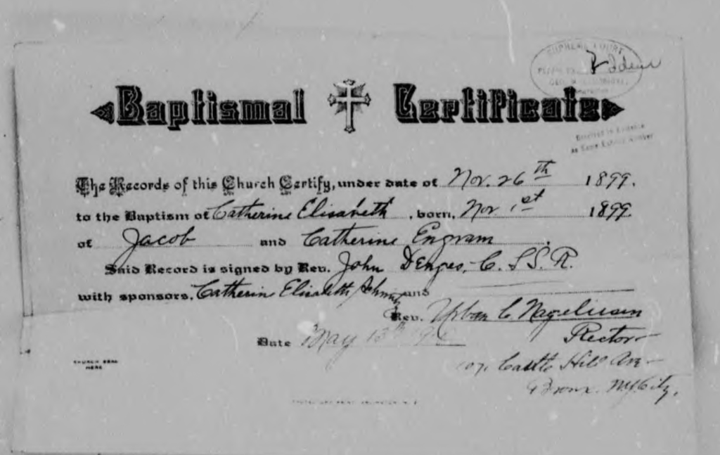 - a note from the reverend of St. Luke’s Evangelical Lutheran Church in the Bronx confirming that Elizabeth was born on November 1, 1899 in New York. This lists her name as Catherine Elizabeth Engram.