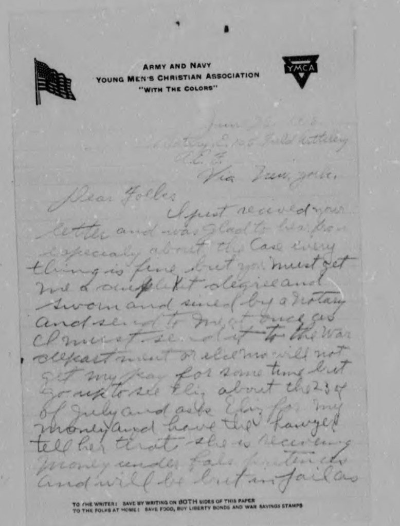 I just received your letter and was glad to hear from you especially about the case. Everything is fine, but you must get me a duplicate degree (decree) and sworn and signed by a notary and send to me at once as I must send it to the War Department or else Ma will not get my pay for some time. But go up to see Eliz about the 23 of July and ask Eliz for my money and have the lawyer tell her that she is receiving money under false pretenses and will be put (?) in Jail (?) as… that is the extent of the letter copied.